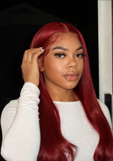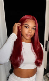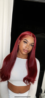 Our 'EVE' wig comes in a gorgeous cherry red. This wig is created with our new luxe Swiss lace which is thicker and more durable than HD lace. This wig will come fully customised meaning we will personally pluck, lightly bleach, trim, and style with baby hairs- So all you have to do is cut the lace and tint to your complexion with powder or lace tint! We also hand sew a weft at the back for added fullness. Please email us after purchase if you'd prefer it without the extra weft at the back and without baby hairs. This wig will come styled so will have light products in it.